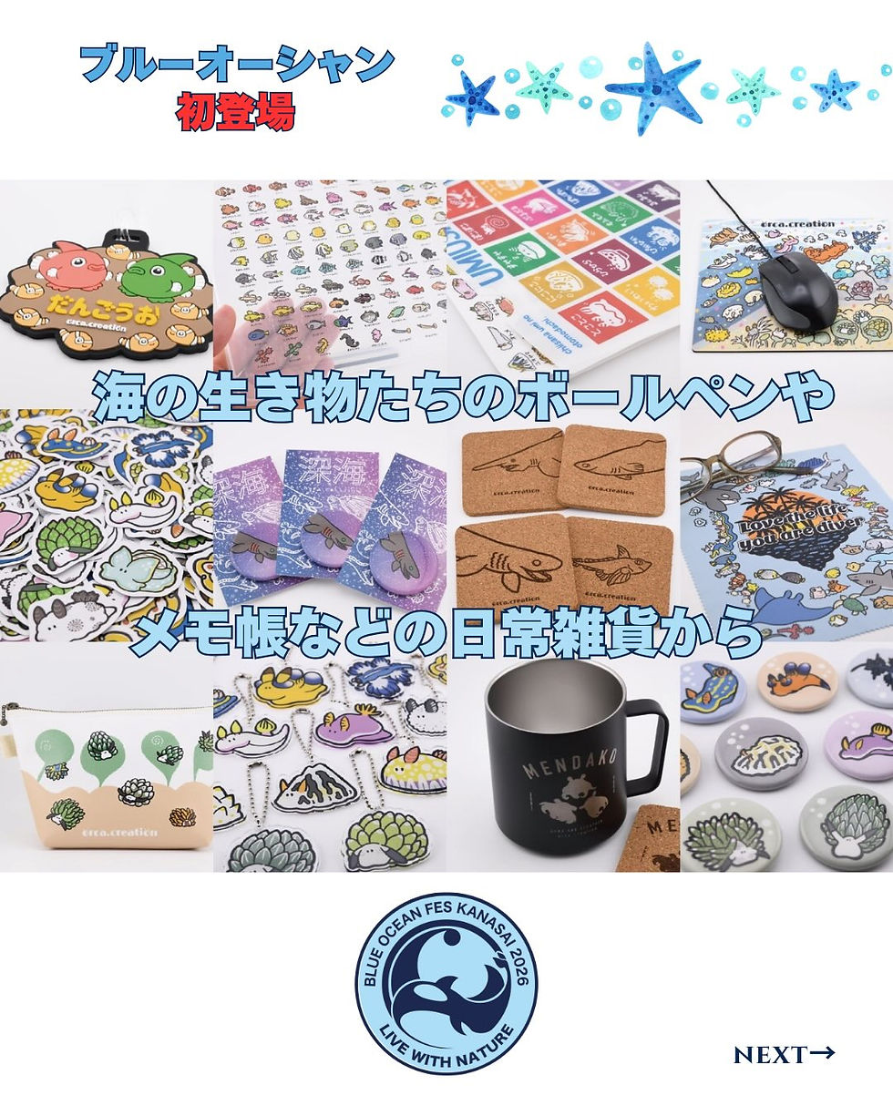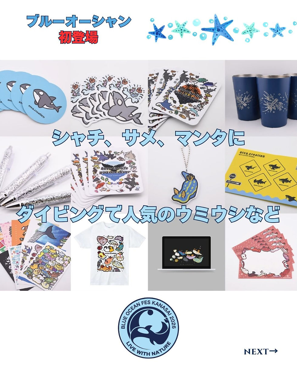 初出展!海の生き物オリジナルグッズショップのorca.creation。シャチ、サメ、マンタ、ダイビングで人気のウミウシなど、海の生き物たちのボールペンやメモ帳などの日常雑貨から、ダイビングで使えるマスクストラップカバーやフィンステッカー、ログブック、GoProワイコンカバーなどをラインナップ。